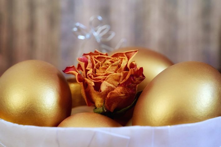 C’est la plus délicate des trois suggestions ici, mais le résultat en vaut tellement la peine. Vous avez besoin d’un adhésif spécial, donc je recommande d’obtenir un kit de démarrage pour votre premier projet. La feuille d’or fonctionne mieux sur les surfaces planes. Si l’or n’est pas votre métal préféré, il existe aussi de la feuille d’argent et de la feuille de cuivre.