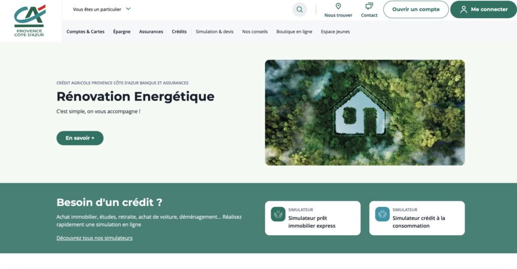 Le site officiel du Crédit Agricole Provence Côte d’Azur propose un simulateur de crédit immobilier en ligne. En seulement 2 minutes, les clients peuvent remplir un formulaire et obtenir une première estimation. Un conseiller les rappelle sous 24 heures pour finaliser l’analyse et proposer un rendez-vous sous 5 jours.